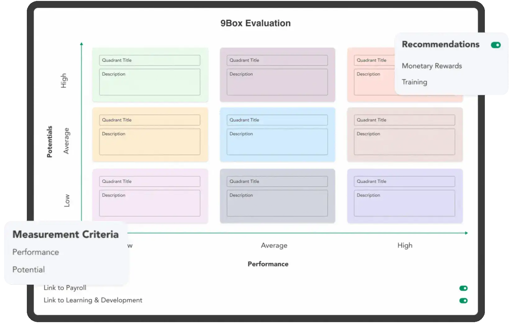 Our application seamlessly integrates the 9-Box Appraisal results with the payroll system, enabling automatic updates to salary adjustments and bonuses based on performance.